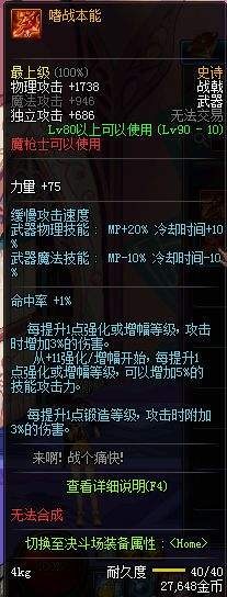 DNF90级版本来袭,90史诗武器进入了我们的视线,那么他们的真正样貌是怎么样的,好不好用呢,下面和小编一起来看看90SS战戟 嗜战本能的属性一览。 高攻击力,高独立,高力量。 特效坑爹,前10级强化增加30%伤害,后面每一级5%。上线很高,下线很低。 如果不能砸到13左右基本没法和别的史诗抗衡。 |