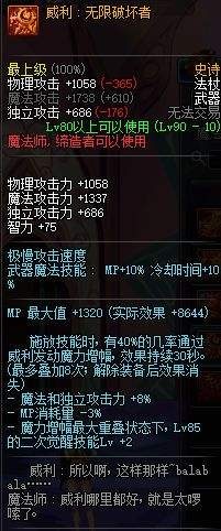 90版本即将上线,90SS武器也是应运而生,魔法师在所有的职业里面的存在感有点低.今天小编就给大家带来魔法师的90SS威利:无限破坏者的属性一览, 首先这绝对是一个刷图神器,他的魔法攻击力高的恐怖,元素和魔道都可以选择它,另外它的特效也是非常不错,攻击时40%的几率可以触发一个30秒BUFF,BUFF可以叠加8次,魔法攻击力和独立提升8%,MP消耗-3%,8层情况下二觉|+LV2,也就是说叠满的情况下,可以获得64%的物理和独立加成!太恐怖了. |