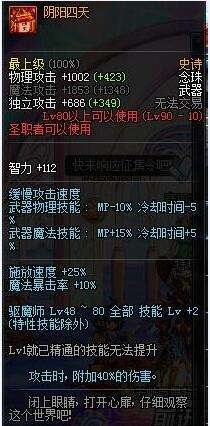 阴阳四天是90SS念珠,那么阴阳四天这件装备到底怎么样,适合什么职业,今天小编就给大家分析一下这一件装备。一起来看看吧。 物理攻击和独立都加的很多,另外高智力加成,对于驱魔来说都是很需要的,适合各种流派。 另外期末48-80的技能全部+LV2,除了特性技能,作为换装来说也非常不错,攻击时附加40%的伤害,简直爆炸好吗,推荐使用。 |