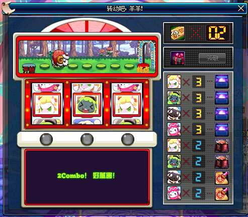 打开转动吧羊羊活动界面,点击相应位置上的按钮,可以旋转到随机一个图案,当相同的图案超过2个以上时就能获得对应的道具奖励。