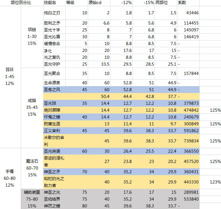 本文仅阐述原作者观点,与本人 / 翻译立场无关 1. 天空 考虑到安定,无起用天空部位的必要性 2. 符文 带CDR的护符只有贪婪之刺 嫉妒之吻只需CDR符文即可30s两次 *表内数据未反应使用一觉之后的10%CDR 1. 天空 考虑安定性,天空耳环是必需品,也可以考虑神焰斩和神焰怒火的护符 2. 符文 带CDR的护符有三个,神焰斩,神焰怒火,行刑 如果是考虑20s能多放一次的话,神焰斩和神焰怒火护符为必须,有天空耳环更稳定 *表内数据未反映使用一觉之后的10%CDR 1. 天空 单耳环可以20s两次龙魂之怒 耳环+护符可以20s两次百八念珠 耳环+项链可以20s三次驱邪咒 2. 符文 带CDR的护符有聚魂吸星符,百八念珠,不动珠箔阵 带个CDR符文可以30s两次因果业火符 注:仅以审判点视角分析,武器不影响CD 1. 天空 单耳环可以20s三次圣光聚合 2. 符文 带CDR的护符有忏悔之锤,圣光突袭 1. 天空 耳环基本是必须,稳定两次疾空旋风破 2. 护符 除了逆鳞击,其余护符均带CDR效果 1. 天空 考虑到一觉会增加部分1-45区间技能CD,这里耳环选天空 2. 护符 带CDR的护符有恶魔之拳,黑暗权能,末日浩劫 单护符可以30s两次末日浩劫,20s两次恶魔之拳 1. 天空 单耳环可以20s两次漩涡重拳 2. 符文 带CDR的护符有及数据风气,破碎之拳 护符+CDR符文可以30s两次破碎之拳 魔法石+手镯可以30s两次破坏之拳,加CDR符文更稳定 |