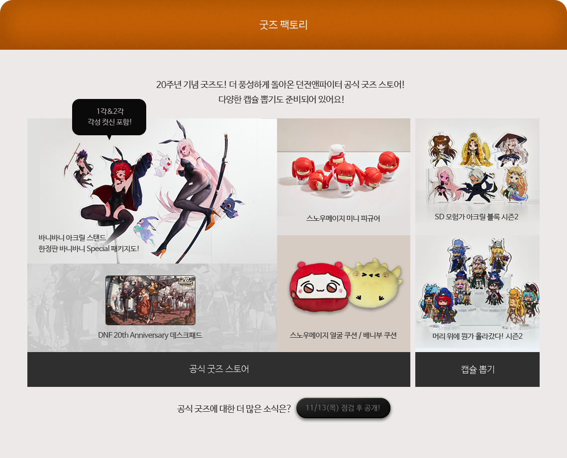 今年嘉年华将于11月22日/23日举行,其中day1(22号)将会有更新发布会展开 day1更新发布会相关 将于北京时间11月22日18点开启,主持人和参与者都是大家的老熟悉了,朴宗民~ 购票特典 购买门票参与嘉年华的玩家,可获得以下专属奖励:5万点券、20周年纪念徽章、20周年纪念帆布袋、纪念票根、20周年嘉年华选择角色界面、三次觉醒扑腾扑腾宠物 线下活动情报:10号馆部分 主舞台节目更新发布会,回忆20周年点点滴滴,雷巴绘画秀宝谦的增幅入门,扑腾扑腾小游戏最强者大作战,20周年纪念音乐会 成就专家vs魔界雪人一起克服魔界雪人的试炼吧!分别为【雪人门派令】、【魔界雪人海盗桶】、【魔界雪人增幅狂欢】、【制作阿拉德汉堡】 周边贩售区域20周年限定周边开卖!更多周边情报11月13日公开 扑腾扑腾像素平原!除了可以体验扑腾扑腾小游戏,还可以看到全职业三次觉醒的扑腾扑腾亚力克周边哦! 阿拉德历史展一起回顾DNF的20周年更新历程,欣赏历代主线插画和每个赛季的OST参与现场问卷调研,还有机会获得画家SSS的OST NFC贴纸哦! 兔子广场Day1与Day2的活动不同Day1 像素市场第七赛季与1V1卡牌游戏Day2 酷酷邦尼团体活动与1V1卡牌游戏参与活动,可获得3种酷酷邦尼宠物哦! 线下活动情报:7A馆部分 DNF IP展示区【DNF音乐记录】包括端游、手游、卡赞等DNF的OST试听区,欣赏20年以来累积的音乐吧,包括交响乐与爵士乐等【DNF像素艺术】欣赏DNF的20年像素发展历史【DNF X 中国版】玩家们的同人作品,欣赏来自中国服DNF的IP展示吧~【DNF 漫画】一起来看看与DNF一起走过的作家们的庆祝活动,不与错过与作者们的见面机会哦!【DNF人物图鉴】DNF的20年历史世界观中众多人物登场,一起浏览他们巨大的关系图 寻找扑腾扑腾 X 聪明的沃利DNF与经典IP《聪明的沃利》合作,快来和穿着可爱条纹的扑腾扑腾角色见面吧! 超赞特辑这个展览可能会消失(还在确认中) DNF街机版DNF宇宙小游戏大联合,快来体验吧! 素喃酿酒厂素喃酿酒厂限时登场,记得带上身份证参与哦! R&B快来领取DNF20周年限定鼠标与鼠标垫吧!参与活动还可获得纪念耳机、T恤等丰厚奖励哦 滋滋滋in洞派ex舞台与阿兹特克一起的DNF嘉年华舞台玩法,在直播中可以看到冒险家们在舞台上进行内容哦!相关内容准备中 与塞勒斯的互动体验在现实世界中体验DNF中的小游戏,化身为无法者,享受乐趣吧!此外还有塞勒斯准备的其他多种体验内容,敬请期待 (来源:colg) |