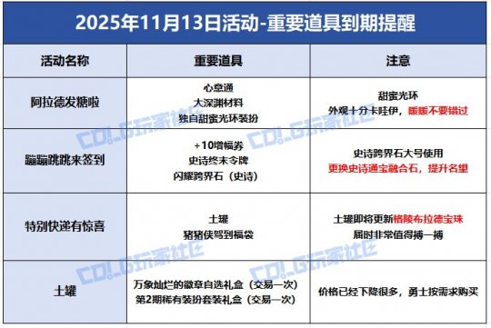 国服将于11月13日迎来更新,将会新增格陵布拉德宝珠等新内容,其中也有部分活动即将过期,一起来看看吧~ 阿拉德发糖啦 主要道具:心意通、大深渊材料、独自甜蜜光环装扮注意:①【甜蜜祈愿礼盒】开启概率获得1111个大深渊材料,勇士们不要忘记开启~ ②【独自甜蜜光环装扮】,无属性光环,外观十分卡哇伊,暖暖不要错过。 蹦蹦跳跳来签到 主要道具:闪耀跨界石(史诗)、+10增幅券、史诗终末令牌注意:①【闪耀跨界石(史诗)】,建议未史诗毕业的大号优先使用,多出的套装积分,更换史诗通宝融合石,提升角色名望。 ②【+10增幅券】,配合战令中的增幅保护券冲击红12,是个不错的选择~ 特别快递有惊喜 主要道具:土罐、猪猪侠驾到福袋注意:①【土罐】,是永久性道具,可以等出好东西时再开,比如即将到来的格陵布拉德宝珠,非常值得搏一搏。 土罐 主要道具:万象灿烂的徽章自选礼盒(交易一次)、第2期稀有装扮套装礼盒(交易一次)注意:①【万象灿烂的徽章自选礼盒】,因为快递赠送土罐的缘故,价格已经下降很多了,有需求的及时购买~ 总结 (来源:colg) |