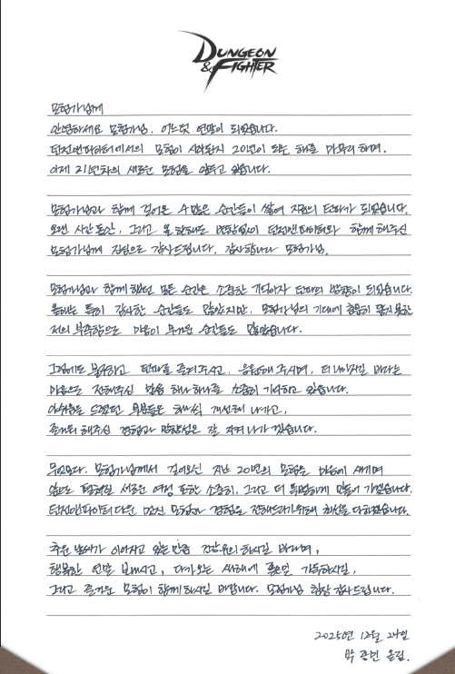 除此之外朴宗民还手写了一份感谢信,基本就是感谢各位冒险家二十年的陪伴巴拉巴拉