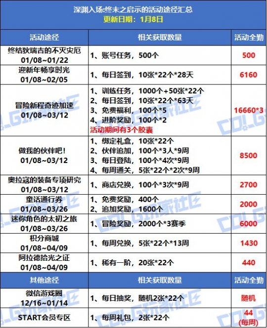 这篇只有一个目的:就是更新任何有关能获取到终末之启示的方式 活动途径包括不限于游戏活动、网页活动、APP活动常驻途径包括不限于每日/周/月的副本、任务、掉落、奖励兑换途径包括不限于相关道具与材料的兑换、拍卖行购买 快速一览(1.8更新) 【活动途径】 【常驻途径】 活动途径 终结狄瑞吉的不灭灾厄1、账号任务,500个终末之启示 迎新年畅享时光1、每日签到,10张*22个终末之启示*28天 冒险新程奇迹加速注意:活动期间有3个胶囊!1、训练任务,1000个终末之启示+50张*22个终末之启示2、每日签到,10张*22个终末之启示*63天3、免费福利,100个终末之启示*5次4、进阶奖励,100个终末之启示*2次 做我的伙伴吧!1、绑定礼盒,10张*22个终末之启示2、伙伴追加,100个终末之启示*3人*9周3、每日登陆,100个终末之启示*4次*9周4、每周通关,5张*22个终末之启示*2次*9周 奥拉寇的装备专项研究1、商店兑换,100个终末之启示*3次*9周 童话通行券1、免费奖励,400个终末之启示2、追加奖励,1600个终末之启示 迷你角色的太初之旅1、冒险奖励,2000个终末之启示*3赛季 积分商城1、每周兑换,5张*22个终末之启示*13周 阿拉德拾光之证1、稀有一阶,20张*22个终末之启示 其他途径 微信游戏圈活动地址:点击跳转1、每日抽奖,随机概率可得2张*22个终末之启示 START会员专区活动地址:点击跳转1、每周礼包,2张*22个终末之启示 常驻途径 每日畅玩任务1、每周一/三/五,完成任务可获得24个终末之启示2、周二/四/六/日,完成任务可获得13个终末之启示(每日限定20个角色) 征讨地下城1、通关噩梦循环可获得140个终末之启示2、通关女神殿可获得120个终末之启示3、通关蔚蓝号可获得100个终末之启示4、通关沉月湖可获得60个终末之启示5、通关索利可获得60个终末之启示(每周限定20个角色)6、通关白云可获得40个终末之启示(每周限定20个角色) 赤红铁矿1、华丽/灿烂/玲珑的衍炼铁匣,40~280个终末之启示(每周最多可编入12名角色参与地下城) 噩梦循环-噩梦调律1、每个调律阶段发放15个终末之启示(账号绑定),共100阶(每周限4个角色) 美神维纳斯军团1、匹配模式,40个终末之启示2、一阶难度,60个终末之启示3、二阶和降临难度,100个终末之启示 人造神纳波尔攻坚战1、单人模式,80个终末之启示2、匹配模式,100个终末之启示3、普通/困难模式,160个终末之启示 雾岚黄昏战1、团本模式,160个账号绑定的终末之启示(每周限定8个角色) 狄瑞吉攻坚战1、普通/英雄模式,160个账号绑定的终末之启示3、匹配模式,120个无法交易的终末之启示4、单人模式,100个无法交易的终末之启示 世界领主1、每周击败领主领感染地补给箱,100~500个终末之启示 2、每周六发放排名奖励礼盒,25~100个终末之启示 美神维纳斯竞拍1、使用维纳斯竞拍参与币,参与共同竞拍分别有4种终末之启示礼盒,分别是200/300/400/500个终末之启示 人造神纳波尔竞拍1、使用人造神竞拍参与币,参与共同竞拍分别有4种终末之启示礼盒200~300、300~400个无法交易的终末之启示200~300、300~400个账号绑定的终末之启示 雾岚黄昏战竞拍1、使用雾岚竞拍参与币,参与共同竞拍分别有4种终末之启示礼盒200~300、300~400个账号绑定的终末之启示500~700、700~1000个账号绑定的终末之启示 深渊宝珠1、通过小深渊地图随机掉落,200个终末之启示 115级达成礼盒1、角色达到115级邮寄领取礼盒,300个终末之启示 兑换途径 赛利亚旅馆—装备之力魔法书1、每个旧史诗灵魂=1个终末之启示2、每个新稀有/神器/传说/史诗/太初灵魂=2/4/30/90/1000终末之启示3、每40个银币=2个终末之启示,每300个银币=20个终末之启示 梦境之塔—怪才邦尼霍恩1、每10个梦境之塔碎片=9个终末之启示 游戏公会—守护精灵商店1、每750个公会硬币=100个终末之启示 艾尔罗斯-次元风暴-无尽妖谱1、每个荒野/樱庭/雪原碎片=1个终末之启示 战利品商店1、每100个涅槃之光=25个终末之启示 (来源:colg) |