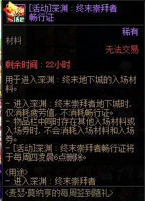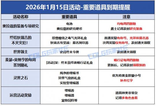 前言 注意!当前虽不是活动更新节点,但仍有不少活动道具面临到期,勇士们记得上线清理~ 奥拉蔻的装备专项研究 主要道具:奥拉蔻的研究硬币、电池注意:①【奥拉蔻的研究硬币】每周四删除,可在全新模拟装置活动,研究装备,最多可以获得9件史诗,勇士一定记得及时参与研究! ②【电池】同样也每周四删除,可在赛丽亚房间里的奥拉蔻商店兑换深渊票、研究硬币等道具,不要忘记兑换使用! 终结狄瑞吉的不灭灾厄! 主要道具:怨憎缠绕之毒气光环礼盒、狄瑞吉攻坚战:易名刻印券注意:①【易名券】和【光环】仅第一周首通可以获得,第二周通关仅可获得【称号】,已经参与通关的勇士记得及时领取! 麦瑟·莫纳亨的每周签到随礼 主要道具:[活动]深:终末崇拜者畅行证礼盒注意:①该【深渊畅行证】每周四删除,周四刷新领取次数后,勇士记得及时领取新的! 灵界之石 主要道具:纯净的增幅书、异界气息的礼盒、实验型增幅器注意:①多为【增幅类】道具,可优先给强效黄金胶囊角色补齐红字~ 世界领主 主要道具:感染第补给箱注意:①【世界领主】每周四刷新次数奖励,新增的迷雾系统使史诗令牌、深渊门票等道具变得重要,勇士不要忘记参与~ 运营活动奖励 主要道具:饲料礼袋、疲劳药、增幅券等注意:①运营类道具比较杂,可能还有增幅器、增幅券等道具也会过期,勇士记得多角色检查! 总结 (来源:colg) |