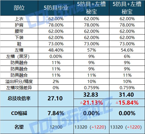 韩服今天更新,对3件秘宝装备有所加强了。由于狄瑞吉秘宝的制作成本是团本材料和狗眼,主要源于日常深渊和周本产出,从个人的身边统计学和最近论坛的讨论热度观察,做狄瑞吉秘宝的玩家并不在少数,因此这个话题对广大玩家而言也是比较有意义的。 不过由于刚开狄瑞吉没有多久,材料的获取缺口也比较大,因此其实存在一个“制作先后”的策略问题。抛开残痕(金币)先不谈,狄瑞吉秘宝制作需要25个太初狗眼和500个史诗狗眼,同时后续也需要30个灾厄之种+40个史诗狗眼调精度。狗眼开销是非常巨大的。笔者在跨五的史诗狗眼拍卖行价格也已经有上涨的趋势了,因此对于晚做的玩家而言可能还会面临一波后续史诗狗眼涨价的风险。不过这部分的成本上升是比较难量化的,对于不同的人而言获取难度不同,也不排除肝帝无需购买狗眼的情况。因此就不定量讨论了。右槽和耳环秘宝由于仍然是拍卖行土豪的专属,目前看来平民玩家购入的不多,这里也不讨论了。奶系提升数值相对C而言低很多,目前看来除了少数大号奶玩家,极少人会为奶投入制作秘宝的财力,这里也不讨论了。本文会基于只做狄瑞吉左槽秘宝的前提下,根据装备的技攻数值,对标的提升和同水准狄瑞吉灾厄之种材料消耗这类相对确定的事项进行对比,同时进行一些简单的策略规划。由于做左槽秘宝的消耗很高,对积分要求也高,制作的角色肯定是相对账号上最好的角色了,伤害也和黑牙数挂钩,因此会默认全身增幅12以及以上的打造,全身毕业SS+3太初黑牙模板考虑。 狄瑞吉秘宝的调精提升 狄瑞吉秘宝在维持太初积分下,一般规律有以下:伤害随精度线性提升,每1点精度提供0.1%的技攻。如40%精度就是4%技攻,调满100%精度为10%技攻。名望方面,白板胚子名望为1750点每1点精度提升5点每25/50/75点额外提升185点满精度额外提升315点。比如75%精度的秘宝,名望计算方式就是1750+75*5+185*3=2680。满精度为1750+100*5+185*3+315=3120。 秘宝和防具升级的优先级讨论 1.计算前提分析由于秘宝(白板)制作需要1200个材料,数量和升级3件防具(480*3=1440)接近。因此它们会形成一个竞争关系。同时也是计算的一个起点。制作秘宝是不会提供单件的积分的。因此第一件事是先计算积分。从上文的基本条件计算,8满调SS+3太初黑牙的积分是245*8+3*215=2605,是足够太初积分的。而左槽去掉以后,积分就只剩下245*7+3*215=2360,需要补3件积分贴膜,积分才能恢复到2360+65*3=2555点满足太初积分的要求。因此,分别计算3防具升级+3通宝贴膜和秘宝提升(白板)+3积分贴膜的情形对比,就可以回答是先升级秘宝还是先升级防具贴膜的问题。其中,3防具升级+3通宝贴膜的情形中,积分会来到2605+3*20=2665点,同时可以满足额外1次70积分兑换1技攻,会多出额外1技攻和100名望。相对3件防具而言,制作秘宝的组合是1200(胚子)+240(调精)的情况,240个材料可以调8手,按25次期望来计算差不多在32%的精度,提供3.2%技攻。 2.防具升级&通宝更替分析下表统计了所有部位的积分贴膜和通宝贴膜之间的强度差距。其中维纳斯防具通宝是11技攻+4%CD的形式,这里整合CD后统一按13%技攻的价值考虑了。从单件提升最低的角度看三槽--是最低的。这意味着希望保留维纳斯CD时,三槽--的使用情况会被优先换成积分贴膜。特化技能是12%占比下差距在3.65%,和维纳斯贴膜相当。但是这只是第一件,第二、三件特化贴膜的收益基础占比系数肯定>12%了,所以收益会有所提升。因此直接对比3件的情况。维纳斯3:1.13^3/1.09^3-1=11.42%特化3(12%):1.17^3*(1.12^3*0.12+1*0.88)/1.145^3-1=11.88%可以看到特化贴膜的价值会更高一些。所以后文更替会优先考虑去除维纳斯防具贴膜。如果更重视全局CD,同时职业技能占比均衡,特化收益不高的情况仍是考虑特殊3舍弃的情形。 其中防具升级情况引用礁石22222的表格,鞋>上下腰>肩。升3件这里采用升鞋+上下装的组合。 3.方案对比下表统计了1200+240材料优先升3防具和优先左槽秘宝(改版前后)的区别。在当前状态下,优先升级秘宝并不划算,只提升1%的伤害(模拟)但是失去了11.53%的CDR,同时名望是低165点的。这一点在改版后会有所改善,相当于用11.53%CDR换了6.43%伤害。可见改版后优先秘宝会成为一个和优先防具差不多的方案,不过名望还是少了点。这里也可以简单计算一下名望的阈值。32%精度的秘宝是1750+32*5+185=2095,它需要成长205点名望弥补(2095+205=2300),则应当在精度达50%的时候,名望1750+50*5+185*2=2370才刚超过。从这个角度而言,先做秘宝存在一个“速冲”的要求,就是精度至少要迅速调到50%以上,才不至于和防具升级相比落于下风。 4.后续升级随着获取的狄瑞吉材料进程的加快,会出现一个新的情况,就是5防具毕业。对于不做秘宝的玩家而言会成为一个终点。此时已经获得了2400个材料,获取了第二轮1200个材料。如果是优先制作左槽秘宝,以25手调满期望计算,仅仅消耗1200+25*30=1950个材料狄瑞吉秘宝已制作完毕,此时还会多出2400-1950=450个材料。考虑到这个数距离480并不远,如果调精运气好可以空出30个材料升级。因此对标的情况可以设置成1防具升级+狄瑞吉满精度秘宝。运气不好的情形相当于少升一个2%的鞋子(名望-100,提升-2%),可以在表内自行修正,作为一个下限差存在。 通过对比发现,第二轮1200个狄瑞吉材料的作用下,秘宝的方案提升是更快的。在这个阶段目前相当于是5.68%伤害兑换11.53%CDR