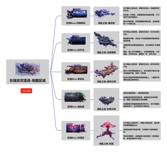 本文整理自DNF官方活动《狄瑞吉攻坚战势力对抗》及官网《DNF宇宙》板块相关资料。 简析 【1】一阶段-次级boss【玛赫纳瓦】,位于上方区域【祸乱之地-晦月湖】,击败后弱化【塞加普】 【2】一阶段-次级boss【拉尔戈】,位于左下方区域【祸乱之地-无信草原】,击败后弱化【塞加普】 【3】一阶段-次级boss【萝布乐】,位于右下方区域【祸乱之地-废弃沙漠】,击败后弱化【塞加普】 【4】一阶段-boss【塞加普】,位于中间区域【祸乱之地-忿恨大地】,击败后开启攻坚战二阶段,【狄瑞吉】降临 【5】二阶段-boss【狄瑞吉】,位于中间区域【祸乱之地-妖篮】,击败本体及融合状态后团本攻坚成功 文字版 【祸乱之地-晦月湖】【区域Boss-玛赫纳瓦】位于祸乱之地北部,是患妖五怪之一玛赫纳瓦所在之处。此处是一片湖泊,连通着碧泉流淌的洞窟,与飞泻而下的空海瀑布。看似宁静优美,实则潜藏着无数妖怪,正窥伺着每一个可乘之机。 【祸乱之地-无信草原】【区域Boss-拉尔戈】位于祸乱之地西部,是患妖五怪之一拉尔戈所在之处。表面看似平静,实则水下与地底都潜伏着伺机而动的妖兽。这里没有任何事物值得信任,所以被称作“无信草原”。据说,踏入这片草原的人,必须时刻警惕、心怀戒备,并牢牢记住:眼前的一切,皆不可信。 【祸乱之地-废弃沙漠】【区域Boss-萝布乐】位于祸乱之地东部,是患妖五怪之一萝布乐所在之处。昔日人类文明的遗迹之上,如今堆满了废弃之物与妖兽的尸骸,如同一片荒漠。在这片由废弃物堆叠而成的地层上,一些属于妖怪的设施正悄然耸立。 【祸乱之地-忿恨大地】【区域Boss-塞加普】患妖五怪的首领——塞加普的领地。这里的地形宛如巨型迷宫,其结构又似天然堡垒,阻断了通往陨星之所的道路。这里曾是文明最鼎盛的悬浮岛中心,如今在塞加普的影响下,往日风貌已不复存在。 【祸乱之地-妖篮】【区域Boss-狄瑞吉】位于祸乱之地的中心,陨星之所的深处,是狄瑞吉的茧曾盘踞之处。狄瑞吉的毒气弥漫不散,已将整片大地彻底浸染。但在妖怪眼中,这里是伟大的妖魔王一度沉眠之地,故将此地称为“妖篮”。 一图流 (来源:colg) |