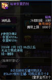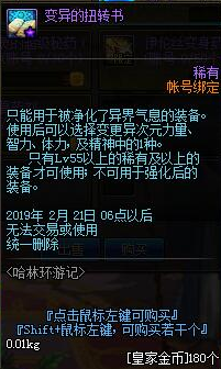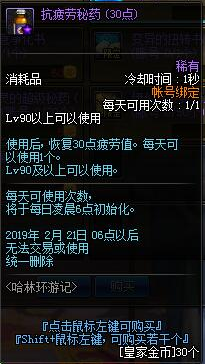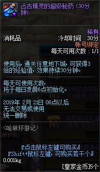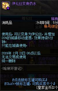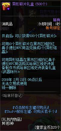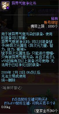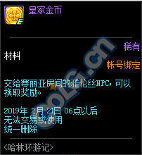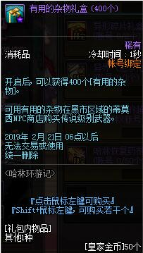 DNF哈林环游记活动开始了,在哈林区域地下城击杀怪物可以获得皇家金币,皇家金币可在NPC雅伦丝商店兑换各种稀有奖励。下面是小编整理的DNF哈林环游记活动的介绍,大家一起来看看吧! DNF哈林环游记活动介绍 活动时间:1月21日 - 2月21日 活动地址:游戏内界面 活动内容: 在哈林区域地下城击杀怪物即可获得皇家金币。 开启后,可以获得400个有用的杂物。 开启后,可以获得500个黑夜穿行之证。 开启后,可以获得500个异形碎片。 使用后,恢复30点疲劳值,每天可以使用1个。 60个皇家金币可以兑换,账号限购1次,用于被异界气息污染的装备,使用时装备可以穿戴。 180个皇家金币可以兑换,账号限购1次,只能用于被净化了异界气息的装备,使用后可以选择变更异次元力量、智力、体力及精神中的1种。 3倍经验药水,每天可以使用1个。 使用后,可以变身为伊伦丝,并增加20%的城镇移动速度,效果持续5分钟。只能在城镇使用。 使用后,恢复15%的HP和MP,冷却时间10秒。 想要第一手礼包消息?加入DNF福利交流群55208583,如有福利群主将直发群员。 以上就是小编为大家带来的DNF哈林环游记活动介绍,更多DNF礼包内容请关注http://dnf.yzz.cn |