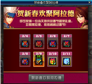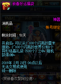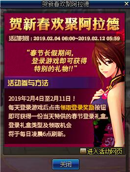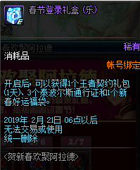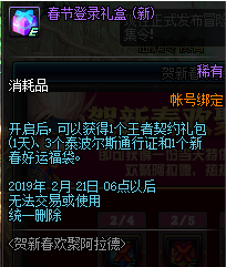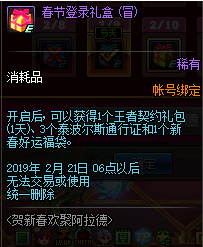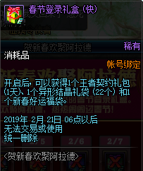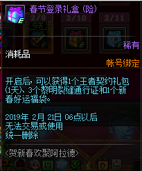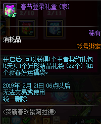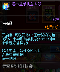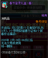 DNF贺新春欢聚阿拉德的活动开始了,在2月4日~12日期间,每天登陆游戏即可领取对应的天数礼盒,并且新春好运福袋中还有几率可以开出500个异形结晶的大奖。 DNF贺新春欢聚阿拉德活动介绍 活动时间:2月4日 - 2月12日 活动地址:游戏内界面 活动内容: 春节期间,每天登陆都可领取对应礼盒。 2月4日奖励 开启后,可以获得1个王者契约礼包(1天)、1个异形结晶礼袋(22个)和1个新春好运福袋。 2月5日奖励 开启后,可以获得1个王者契约礼包(1天)、3个泰波尔斯通行证和1个新春好运福袋。 2月6日奖励 开启后,可以获得1个王者契约礼包(1天)、3个黎明裂缝通行证和1个新春好运福袋。 2月7日奖励 开启后,可以获得1个王者契约礼包(1天)、1个异形结晶礼袋(22个)和1个新春好运福袋。 2月8日奖励 开启后,可以获得1个王者契约礼包(1天)、3个泰波尔斯通行证和1个新春好运福袋。 2月9日奖励 开启后,可以获得1个王者契约礼包(1天)、3个黎明裂缝通行证和1个新春好运福袋。 2月10日奖励 开启后,可以获得1个王者契约礼包(1天)、1个异形结晶礼袋(22个)和1个新春好运福袋。 2月11日奖励 开启后,可以获得1个王者契约礼包(1天)、3个泰波尔斯通行证和1个新春好运福袋。 新春好运福袋属性 开启后,可以从2~100个闪亮的雷米援助、2~100个闪亮的世界仪和1个异形结晶礼袋(500个)之中,随机获得1种。