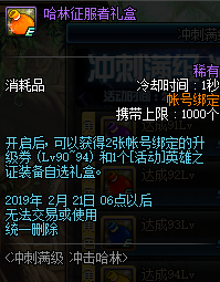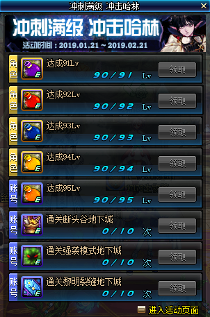 DNF冲刺满级 冲击哈林的活动开始了,升级路上福利领不断,每升1级可在活动页面领取等级达成礼包。下面是小编整理的DNF冲刺满级 冲击哈林活动的介绍,大家一起来看看吧! DNF冲刺满级冲击哈林活动介绍 活动时间:1月21日 - 2月21日 活动地址:游戏内界面 活动内容: 活动期间:达到相应等级即可领取对应等级的礼包,完成通关指定地下城次数即可领取指定地下城礼包。 91级~94级的礼包都是各种药剂,94级的礼包多了1个10%的成长胶囊。 达成95级可领取,开启后,可以获得2个账号绑定的升级券(90~94)和1个[活动]英雄之证装备自选礼盒。账号限领1次。 通关断头谷地下城10次即可领取,开启后,可以获得100个有用的杂物。账号限领1次。 通关强袭模式地下城10次即可领取,开启后,可以获得100个污浊的不祥气息。账号限领1次。 通关黎明裂缝地下城10次地下城即可领取,开启后,可以获得100个异形碎片。账号限领1次。