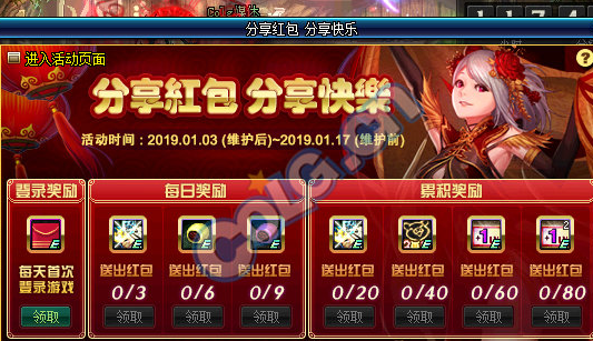 DNF分享红包分享快乐活动开始了,每天分享红包可以获得2019贺年糕点和1天王者契约礼包,分享红包次数达到40次更可领取2019猪圆玉润光环装扮礼盒。下面是小编整理的DNF分享红包分享快乐活动的介绍,大家一起来看看吧! DNF分享红包分享快乐活动介绍 活动时间:2019年1月3日 - 1月17日 活动地址:游戏内界面 活动内容: 每天登录可领取一次[新年红包],在推荐地下城中可收集[红包碎片],每8个[红包碎片]可合成1个[新年红包],每天累积分享[新年红包]可获得奖励(每天最多分享10次), 每天送出3个新年红包,可以领取1个1天的王者契约礼包。 每天送出6个新年红包,可以领取1个2019贺年糕点(5百分比)。 每天送出9个新年红包,可以领取1个2019贺年糕点(10百分比)。 累积送出20个新年红包,可以领取1个5天的王者契约礼包。 累积送出40个新年红包,可以获得1个2019猪圆玉润光环装扮。 累积送出60个新年红包,可以领取1张Lv87~89级升级券。 累积送出80个新年红包,可以领取2张Lv87~89级升级券。 想要第一手消息的,有问题不懂的,没人带你混团的,进来你就都可以解决锁定下方企鹅群速度进来吧55208583 |