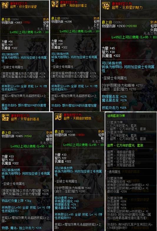 DNF国服95版本已然上线3天,各路英雄豪杰纷纷开启阿拉德大陆的新征程,除了光速满级之外,史诗装备制作之路上也挤满了来自阿拉德的各位勇士。 这其中自然不乏因为新版本开启而回流的昔日英雄,而他们很可能面对着全新的内容和史诗系统感觉无从下手。小编今天就与各位勇士一同复习一下95版本史诗套的强度排名,希望能够帮助各位回归的勇士尽快适应版本,踏上全新征途。 首先我们来一起回顾一下最早从韩服流出的95A套提升率 我们可以看到,皮甲和重甲在大部分职业的主要输出技能(一觉和二觉)的加成都相对偏低,所以长期以来网上一直黑这两款套装也不是没有道理的,而布甲和轻甲套针对一二觉的加成相对较高,其中又以轻甲套的加成最高,因此在完美打造的前提下,轻甲套当之无愧的是版本第一史诗套! 当然了,提升率这些都是老生常谈的内容,版本上线后,国服95史诗B套超界系列装备的庐山真面目也展示在我们面前,今天我们就以轻甲A套升级后的轻甲套B套为例,看看这新的天下第一套毕业后究竟都带来了哪些加成。 星光套装的详细加成如下: 基础效果: 一觉及二觉LV+2 额外增伤20%、额外爆伤20%、技能攻击力18%、攻击力面板21% 40点属性强化 14%双暴及4%移动速度 223点力量及148点智力 套装效果: 属抗+15 一觉二觉LV+2 最终伤害+25% 属性白字35% 10%攻速、10%移速、15%释放速度 攻击时5%几率产生末日之光(CD60秒) 从效果上我们也可以看出,轻甲套共加了高达4级的一觉和二觉技能,这也是它能够获得极高的一二觉加成率的原因,但也正因此使其并非完美契合所有职业,因为总有一些职业的一二觉技能由于技能形态或者输出方式,不是那么的强,小编在这里就不举例说明了... 针对于这些职业,主打觉醒技能加成的星光套就没有那么强了,可以选用加成更为平稳的板甲套,如果喜欢打单机的话(如果真的能打单机的话),也不妨尝试一下重甲套,单刷全程霸体和移速加成效果还是非常不错的。 轻布板重皮,总有一款适合你。总的来说因为加成计算都是建立在完美附魔及各项搭配上的,实际情况总会与之有差别,提升幅度也要看各位勇士的打造程度。因此在版本初期暂时先不用刻意去追求号称天下第一的星光轻甲套装,那么穿什么套好呢?借用一句深渊斗士口口相传的至理名言:先出哪套穿那套! |