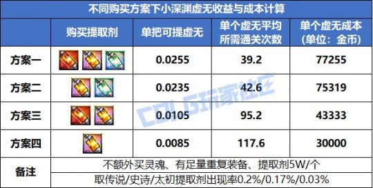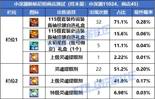 前言 金秋版本,帕尼柏商店也是上新了。原价四百多五百多的史诗盒子,现在只要五块钱!没错,只要五块钱!三种提取剂也统统五块钱,样样五块钱!可以爆刷小深渊肝虚无了。那么,新商品出现概率是多少?原商店出现几率是否受到影响?笔者用近一个月的小深渊数据来回答这些问题。 新帕尼柏商店简介 1. 出没地点新帕尼柏商店以黄金帕尼柏的店面出现,通关大小深渊和征讨本时都有几率见到它。PS:“新”特指卖新商品,卖旧商品的帕尼柏商店还会出现,没有被替换掉哦。2. 商品栏位没有黑钻时,新帕尼柏商店只有一个栏位,随机出售装备盒子、星辉盒子和提取剂。有黑钻时,新帕尼柏商店开放第二个栏位,固定出售提取剂。 3. 定价机制新帕尼柏商店出售道具的基础价格均为5万金币。在此基础上会有10%的浮动,最终售价可能为4.5W/5W/5.5W金币。4. 商品介绍新帕尼柏商店出售6种道具,具体内容如下: 传说盒子和史诗盒子大家都比较熟悉了,相比旧版的盒子更省金币但要多花灵魂。星辉盒子则是提供了太初灵魂转换为账绑星辉的途径,这可不是魔法书商店3星辉换1账绑的版本,千万注意! 三种提取剂则是将重复装备转换为虚无之魂的凭证,笔者习惯叫它们“传说/史诗/太初提取剂”。用提取剂获取虚无的成本(单位:金币)如下表所示: 账绑灵魂充足时,提取虚无性价比最高的是上级灵魂(史诗)提取剂,1虚无3万金币,另两种则是10万金币。 新商品出现率 新商品都很好,但是为什么碰不到呢?笔者测试了1.1万次小深渊,总共就遇到45次新帕尼柏商店(商店概率0.4%),具体情况如下: 与原黄金帕尼柏商店类似,传说盒子与史诗盒子的比例≈9:2。但由于新帕尼柏整体出现概率较低,导致新史诗盒子出现率仅为0.062%,平均肝67管188PL小深渊才能见到一次。出现双提取剂的概率非常低(万分之一),更别提出现双太初提取剂的情况了。 绝大多数情况下,一次新帕尼柏商店可买到1个提取剂,50%左右传说提取剂,40%左右史诗提取剂,10%不到太初提取剂。所以太初提取剂的出现率大概率≤0.04%,出4~5件太初大约能见到一个它。根据提取剂出现率可以计算不同购买方案下,小深渊每把可得虚无数和单个虚无成本: 提取剂全买时,一个角色刷6天的小深渊平均能提取3.6个虚无,10个角色刷一个月就是147个虚无,提取消耗1130W金币。如果为了降低虚无获取成本只买史诗提取剂,那么单角色刷6天小深渊平均能提取1.2个虚无,10个角色刷一个月就是49个虚无,提取消耗147W金币,比前者虚无产出速度下降了66%,成本降低了60%。不过由于测试样本量较少,各提取剂的出现率不够精确,上表中“单个虚无平均所需通关次数”可能存在较大的偏差,以上结论仅供参考。 原神秘商店几率变化 新商店会不会挤掉一部分老商店呢?策划笔记里说不会,实测结果也是如此。 虽然老商店的黄金帕尼柏和故事中的玛虎出现率有些差异,但基于统计检验(置信水平95%),认为9月11日前后原神秘商店的出现率没有显著差异,即出现率不变的可能性较高。目前看来,新黄金帕尼柏商店的出现率约为老的一半,介于故事中的玛虎和闪闪明出现率之间。遇见的3个史诗盒子里平均2个是售价500W的旧盒子,1个是5W的新盒子。友情提醒,新盒子只会与提取剂一起卖,请擦亮眼睛,别买错盒子。 结语 笔者刷小深渊经历了四个时期:刷套装(周周有提升)、刷盒子(野生很难提升)、刷灵魂和歼灭票(调适提升)、刷虚无和新盒子(追求跨界太初)。不过小深渊的虚无获取效率太低了,提取剂全买一把小深渊也只有神器级新深渊的1/11。 (来源:colg) |