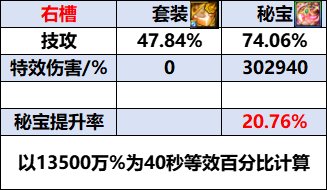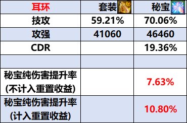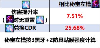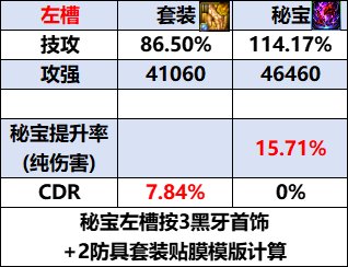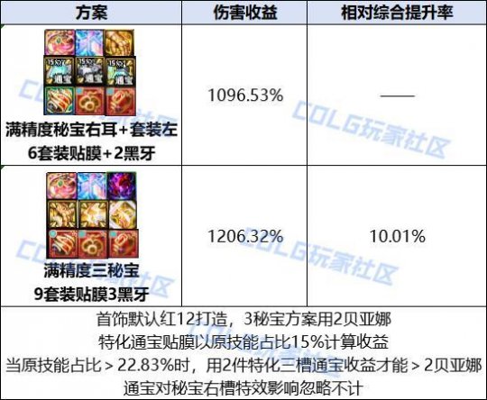 秘宝左槽单件属性&单秘宝提升率 之前的秘宝装备都有各自的特色,右槽有随精度提升的特效伤害[地震波],耳环有概率重置技能的[不稳定性]。 相比起来,左槽的属性就显得单调很多,特色属性[黑色吐息]是绑定黑牙首饰的纯伤害提升属性。 在使用单件秘宝的情况下,升级5件防具后,积分会是265*8+245*2=2610积分,可以再带一件黑牙。 [黑色吐息]会放大黑牙首饰的提升率,即使是提升最低的黑牙手镯,提升率也会达到4.47%, 可以认为比防具通宝贴膜的综合提升率高一些,因此再把2件通宝防具贴膜换成套装贴膜可以算出以下提升率。 3件秘宝之间的强度对比 在聊3秘宝搭配之前得先对3件秘宝的单件提升率进行比较, 这个环节是为了确定秘宝之间的强度优先顺序,以确定影响提升率的通宝贴膜是哪些。 首先是两件纯伤害秘宝之间的比较, 可以看出秘宝右槽的提升率要高出许多, 即使是职业强度变得更高,导致特效伤害收益降低,也很难将这差距扳回。 因此可以确认秘宝右槽优先级>秘宝左槽。 之后是秘宝左槽和耳环的比较。 可以看到,即使是不计算不稳定的重置收益, 秘宝耳环相较秘宝左槽也是用7.51%伤害提升换了25.68%的CDR,兑换比例达到了优质的1:3.419。 除非是完全不需要CDR、只打一套技能的场合,否则可以认为秘宝耳环更有优势。 当然秘宝左槽也不是没有优势,在制作的过程中没有[古老的秘宝玛瑙]这样的材料需求,取而代之的是不断在降价的[史诗灵魂]和[太初灵魂],在制作成本上会更亲民一些。 最终可以确定,在不考虑成本的情况下,秘宝的优先顺序是右槽>耳环>左槽, 后续搭配方案也会基于这个优先顺序来计算。 3秘宝实际搭配方案&提升率 在确定先后顺序后,便可以计算得出3秘宝搭配下,秘宝左槽的提升率约为10%左右, 实际因为少2通宝贴膜,对秘宝右槽和武器特效伤害有影响,会再比10%略低一些。 该搭配需要9件套装贴膜,因此只能搭配2件通宝贴膜。 只有在有技能原占比>22.83%的情况下才会用2件特化贴膜,除此之外都选择2件贝亚娜更优。 (来源:colg) |