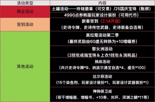 (最终奖励只能拿一次 所以挑战活动只有2个通宝 3史诗令牌) 这次上线了一些活动,虽然数量上比不上1.8号那波,不过这次奖励的内容要多一点,按照惯例整理奖励+分析活动。 商业活动 1.土罐活动 去年3月也有一波类似的活动,当时是售卖5技攻,当时因为默认国庆要升级为7技工所以就没有太多讨论度。 不过这次第二年就把最新特色7技攻放入魔盒的情况有点少见了,应该是回归玩家太多了? 按照之前的概率来说大概300-400多出一个吧,也堪比一套国庆了,黑的话估计要500-600了。 另外还有一个点可以关注下,新春打造的人是比较多的,可能因为这个活动激发了一些玩家的增幅打算?增幅券的价格估计会有波动。 2.达尔菲的时装活动 (可用代币购买) 有关注论坛或者经常刷B站的玩家应该有印象,这次时装是韩服玩家参与设计的。当时还在讨论国服能否上线的问题,结果上了还是比较出乎笔者的预料的。按照现在的金价来看差不多就是2800w左右能拿下一套吧,和去年3月份兔女郎礼包的时装价格差不多。 只能说不愧是玩家设计的,好几套都比较有特色,虽然送了一套,不过根本不够,暖暖党的钱包又要被打劫了 另外这套时装是可以染色的。 签到活动(2.14开启) 活动持续:2.14-2.26(7周49天) 签到奖励: (当日签到奖励*2,补签的话只有1倍奖励) 太初之旅冒险增加券*8 史诗令牌*4 深渊入场券*120 终末之启示*3000 大深渊入场*6 研究所遗物*800(100=1次入场) 心意通*1332个 土罐*5-30个 欢乐代币*1776 累积奖励: 3次:神驹伤害字体*1、史诗传世武器自选*1 5次:神驹武器装扮*1、史诗装备自选*1 8次:神驹装扮*1、史诗令牌*2、终末之启示*1500 物价影响: 有大批入手玲珑自选可关注2月17、20、24日盒子的玲珑价格(均有送罐子),目前新春礼包里的玲珑价格是2000w。(这次上线了7技攻宝珠,再加上送的盒子,盒子里产出的价格可能会低一些) 其他活动 核心道具省流:+10增幅券*4、纳波尔通宝自选*4、史诗自选*1、深渊之鳞一套、戒指2技攻/120四维二选一一个1.奥拉蔻活动第二季 活动持续:2.05-3.12 奖励内容:第二季和这季区别不大,只不过由60个虚无换成了+10增幅券。 注意事项:需要注意的是装备制作点数和栏位会清空,所以记得在这周尽量把9个格子给情况,多号党的话应该会觉得不够用。 另外模拟装备这里不用担心,会继续保留,所以9个资格用完了的等第二季开了再提取也是一样的。个人觉得这个活动还是不错的,至少比深渊500w买罐子强多了,主要就是不限制角色,这个角色重复了也可以给另一个缺装备的号来提取。 2.婺女洲活动 活动持续:2.05-3.12 奖励内容:亮点就是戒指2技攻/120四维的毕业附魔,像上衣1技攻或者四维拍卖也是白菜价,至于剩下两个在纳波尔商店就能换更是一点用没有。 剩下的就是省点斗神钱、外带一个属强+10药。 3.挑战活动(2.26开启) 活动持续:2.26-3.26 奖励内容: 每周可领深渊入场券*30和阶段奖励 (阶段奖励只能领一次 只推荐第三阶段) 第一阶段:史诗令牌*3 第二阶段:史诗令牌*3、纳波尔/维纳斯通宝自选*2 第三阶段:史诗令牌*3、纳波尔/维纳斯通宝自选*2、虚无之魂*100 4.达尔菲活动(2.26开启) 活动持续:2.26-3.26 每日奖励: 每天答题可获取染色剂*1,失败的话再通关推荐地下城*2可增加次数,所以必定可获取。共计染色剂*15。 累积奖励: 每累积参与8次可获得武器装扮、参与15次可获取时装,也就是上面那个4990点券买的,错开售卖时间才开活动应该是为了不影响销量。 5.神驹保卫战 活动持续:2.05-3.12 奖励内容:点每天参与可获取红包和硬币,硬币用于在商店换各种道具。 不过外观道具随机有点难评了,从前年的神兽光环到现在已经出了好几次随机外观活动了。而且质量都还不错,然后保底的话固定给一个。 累积奖励: 25%:增幅书*2 50%:硬币*200、神驹宠物 75%:+10增幅券*1 100%:硬币*300、神驹光环 商店奖励: +10增幅券*2 增幅保护券*1 一觉插图*1 变装道具*1 伤害字体*1 黄金增幅书*1 神器深渊之鳞*12(武器*1+部位*11) (来源:colg) |