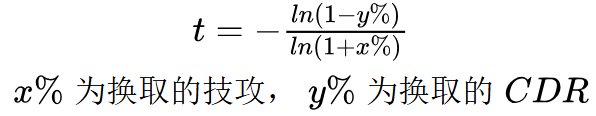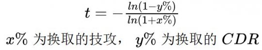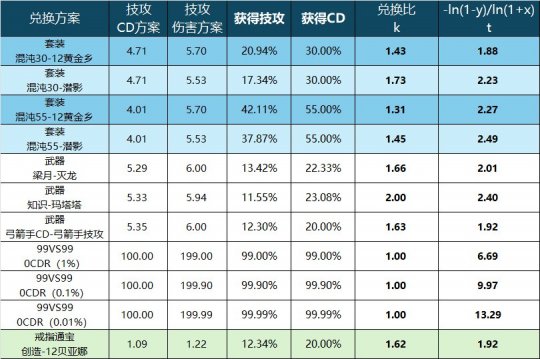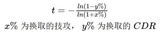 有网友询问关于混沌净化的CDR兑换比的问题,并认为大概没有这么低。首先我会回复,这种认知观点是非常正确的。混沌净化的CDR价值确实非常高。但是我也会说我关于兑换比的计算并没有错。因为混沌净化(堕落)的技攻是301.1%,如果对标的是潜影,是453%的技攻。他们的差距是5.53/4.011-1=37.87%的伤害,相应的,混沌相当于舍弃37.87%的伤害换了55%CD,兑换比是55/37.87=1.45。和常规的比如12.3对20的1.6差距很大。看似是一种比较低的兑换比。 在这个问题中,其实1.45并没有算错,看着很低也没有算错,混沌CDR实际上挺厉害这件事,其实也没有错。那么问题在哪里呢?答案其实是在我们一直认知的“CDR兑换比”这个概念。如果把我们日常理解CDR收益问题的不便,理解成一个近视患者看不清周围的物体,那么“CDR兑换比”其实就是一副眼镜。问题在于这幅眼镜它不太合适,所以让我们看到的CDR收益更为歪曲了。当然,本文也会介绍一下什么才是一副比较合适的眼镜,如此可以更好地洞悉CDR收益论的本质。 CDR兑换比的引入 为什么我们日常中经常会用到CDR和技攻兑换比呢?其实是因为,游戏中的CDR装备种类相对而言是比较多的,数值设置的又不一。对于伤害最大化的角度来说,自然是希望尽可能地少牺牲伤害,而尽可能多地获取CDR。 从这个逻辑出发,考虑它们的比值,自然也会推导出一些结论,比如比值是越大肯定是越好的。因为比值大通常说明使用了相同的技攻下,获得了相对而言更多的CDR。而公式的出发点,用弓箭手的传世武器就非常容易理解。在同样324.7技攻的底子上,你究竟是选择12.3%的技攻呢,还是选择20%的CDR呢?这个所谓的12.3%和20%CDR是策划设置的,因此也会带来一个所谓的“版本比例”的说法。一般来说比例的计算就是采用20%/12.3%=1.626得到一个结论。与之类似的也有贝亚娜戒指和创造戒指的竞争,关系是20CD和12.34%(红12)/11.23%(红11)/10.14%(红10)的技攻竞争。很明显从结果论来说,创造戒指对于红12以下的情况来说是收益相对弓箭手武器是更好的,因为损失的技攻并不足12.3%。如果同样要20CDR的条件下,作为一个增幅不足12的弓箭手职业,他会选择传世武器开12.3技攻+创造戒指,而非传世武器开20CDR+贝亚娜这个方案。 CDR兑换比的异化 上一章可以理解为CDR兑换比这个认识CDR收益的眼镜的工作原理,它是怎么计算的,又是从哪里来的。这一章要说明的事就是,这幅眼镜为什么并不是在任何时候都是非常靠谱的。在以前我发过不少CDR的帖子,CDR设置上限这篇帖子也提到了无CDR是一种多么可怕的现象,举了一个例子是99%技攻换99%CDR,根据公式而言其实就是CDR兑换比仅仅只有1,但是从宏观看,本质是让你的技能伤害减半,但是频率增加了100倍。他会导致什么结果。类似的无CDR问题,可以猜猜下面这个是个什么职业,这套配装在国服活了多久,主保的技能跟主流的大技能比,基础伤害有没有到一半。答案也就显而易见了。因此,CDR兑换比低,是不能等同于CDR收益低的。他们绝对不是充要条件。只不过是CDR收益低的情形,往往会推出一个看上去不怎么高的CDR兑换比。所以逻辑上讲,只是个充分条件而已。 那么这种异化的来源是什么呢?其实问题在于CDR的计算公式和技攻的计算公式是完全不同的。从下面的公式不难发现一点,兑换比k是y/x,而y(CDR)的计算公式中,随着第二项CDR,第三项CDR的引入,它最终的表现值y必定小于拼凑成他的各项分项之和。也就是说,拼凑的CDR越多,y的增长是越慢的。而技攻x则不同,他最终表现值x必定大于拼凑成他的各项分项之和。拼凑的CDR越多,x的增长是越快的。那么当然的结果就是,随着身上的CDR分项越来越多,这个兑换比k显然会往越来越低的方向走。 但是别忘了一个最根本的事情,就是任何一个大CDR和大技攻的兑换,本质都可以理解成一大堆小的CDR和小技攻兑换拼凑在一起的结果。可以观察以下表格,理解起来并不复杂。就是如果有一个2%技攻兑换成4%CDR的分项,他们凑成的组合,未来会变成什么样子。这里的12.62%技攻换21.72%,本质上是6个2%技攻和4%CDR分项的结果。技攻方面是1.02^6-1=12.62%,CDR方面则是1-0.96^6=21.72%。但是正常来说,这个拼了6次的2%技攻对4%CDR,他的价值其实不应该被异化的这么厉害。单纯只是对这个结果做比例来判断他们的价值,其实是不合适的。 一副更好的眼镜 对于上述的异化问题,其实我们不妨这里引入下面的公式,用t来表达,作为一个新的“兑换比”概念。相当于换了一副眼镜,让我们可以更好地看清楚CDR兑换比的问题。 这个公式其实是推导出来的,过程会放在后续,对此有兴趣的读者可以去了解一下。这里我们先观察一下这个公式对多个2%技攻兑换4%CD的结果变化。如下表所示。每一个兑换关系都是整齐的2.06。这是因为-ln(1-4%)/ln(1+2%)=-ln(1-7.84%)/ln(1+4.04%)=......=-ln(1-21.72%)/ln(1+12.62%)=2.06144 也就是说,在这个新的兑换公式算法下,其实不管同样的CDR比例叠了多少次,最后显示的结果都是一样的。至于为什么是2.06,略大于4/2也很容易理解。因为2%技攻对4%CDR,完全也可以认为是一个更小的技攻和CDR对偶关系拼凑而成的。这个兑换比必然是大于2的。实际上这个t就是兑换比k在不断往小进行缩放下的极限值。对此我们也可以把之前秘宝帖子里的几个CDR关系,右边增加一列,观察。作为一个参考组,增加了3个接近0CDR方案的对比。首先第一个结论就是混沌净化在新的兑换比