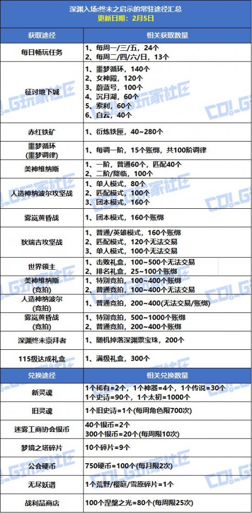 这篇只有一个目的:就是更新任何有关能获取到终末之启示的方式 活动途径包括不限于游戏活动、网页活动、APP活动常驻途径包括不限于每日/周/月的副本、任务、掉落、奖励兑换途径包括不限于相关道具与材料的兑换、拍卖行购买 快速一览(2.5更新) 【活动途径】 【常驻途径】 活动途径 玩转重力之泉1、每周任务,200个终末之启示*5周 新春喜聚阿拉德1、日期签到,10张*22个终末之启示*6天*2倍2、日期签到,750个终末之启示*2天*2倍3、累计签到,750个终末之启示*2个 冒险新程奇迹加速注意:活动期间有3个胶囊!1、训练任务,1000个终末之启示+50张*22个终末之启示2、每日签到,10张*22个终末之启示*63天3、免费福利,100个终末之启示*5次4、进阶奖励,100个终末之启示*2次 做我的伙伴吧!1、绑定礼盒,10张*22个终末之启示2、伙伴追加,100个终末之启示*3人*9周3、每日登陆,100个终末之启示*4次*9周4、每周通关,5张*22个终末之启示*2次*9周 奥拉寇的装备专项研究1、商店兑换,100个终末之启示*3次*9周 婺女洲福运对对碰1、商店兑换,10张*22个终末之启示*3次*5周 神驹保卫战1、每日任务,80个终末之启示*35天 童话通行券1、免费奖励,400个终末之启示2、追加奖励,1600个终末之启示 迷你角色的太初之旅1、冒险奖励,2000个终末之启示*3赛季 每周挑战,惊喜不断1、每周任务,30张*22个终末之启示*4周 积分商城1、每周兑换,5张*22个终末之启示*13周 阿拉德拾光之证1、稀有一阶,20张*22个终末之启示 其他途径 DNF×抖音1、每日抽奖,概率获得10张*22个终末之启示 宿命由我改写1、每日抽奖,概率获得2张*22个终末之启示 网吧特权1、网吧专属,5张*22个终末之启示 DNF×云游戏伙伴1、每日抽奖,概率获得2张*22个终末之启示 微信游戏圈1、每日抽奖,概率获得2张*22个终末之启示 START会员专区1、每周礼包,2张*22个终末之启示 常驻途径 每日畅玩任务1、每周一/三/五,完成任务可获得24个终末之启示2、周二/四/六/日,完成任务可获得13个终末之启示(每日限定20个角色) 征讨地下城1、通关噩梦循环可获得140个终末之启示2、通关女神殿可获得120个终末之启示3、通关蔚蓝号可获得100个终末之启示4、通关沉月湖可获得60个终末之启示5、通关索利可获得60个终末之启示(每周限定20个角色)6、通关白云可获得40个终末之启示(每周限定20个角色) 赤红铁矿1、华丽/灿烂/玲珑的衍炼铁匣,40~280个终末之启示(每周最多可编入12名角色参与地下城) 噩梦循环-噩梦调律1、每个调律阶段发放15个终末之启示(账号绑定),共100阶(每周限4个角色) 美神维纳斯军团1、匹配模式,40个终末之启示2、一阶难度,60个终末之启示3、二阶和降临难度,100个终末之启示 人造神纳波尔攻坚战1、单人模式,80个终末之启示2、匹配模式,100个终末之启示3、普通/困难模式,160个终末之启示 雾岚黄昏战1、团本模式,160个账号绑定的终末之启示(每周限定8个角色) 狄瑞吉攻坚战1、普通/英雄模式,160个账号绑定的终末之启示3、匹配模式,120个无法交易的终末之启示4、单人模式,100个无法交易的终末之启示 世界领主1、每周击败领主领感染地补给箱,100~500个终末之启示 2、每周六发放排名奖励礼盒,25~100个终末之启示 美神维纳斯竞拍1、使用维纳斯竞拍参与币,参与共同竞拍分别有4种终末之启示礼盒,分别是200/300/400/500个终末之启示 人造神纳波尔竞拍1、使用人造神竞拍参与币,参与共同竞拍分别有4种终末之启示礼盒200~300、300~400个无法交易的终末之启示200~300、300~400个账号绑定的终末之启示 雾岚黄昏战竞拍1、使用雾岚竞拍参与币,参与共同竞拍分别有4种终末之启示礼盒200~300、300~400个账号绑定的终末之启示500~700、700~1000个账号绑定的终末之启示 深渊宝珠1、通过小深渊地图随机掉落,200个终末之启示 115级达成礼盒1、角色达到115级邮寄领取礼盒,300个终末之启示 兑换途径 赛利亚旅馆—装备之力魔法书1、每个旧史诗灵魂=1个终末之启示2、每个新稀有/神器/传说/史诗/太初灵魂=2/4/30/90/1000终末之启示3、每40个银币=2个终末之启示,每300个银币=20个终末之启示 梦境之塔—怪才邦尼霍恩1、每10个梦境之塔碎片=9个终末之启示 游戏公会—守护精灵商店1、每750个公会硬币=100个终末之启示 艾尔罗斯-次元风暴-无尽妖谱1、每个荒野/樱庭/雪原碎片=1个终末之启示 战利品商店1、每100个涅槃之光=25个终末之启示 (来源:colg) |