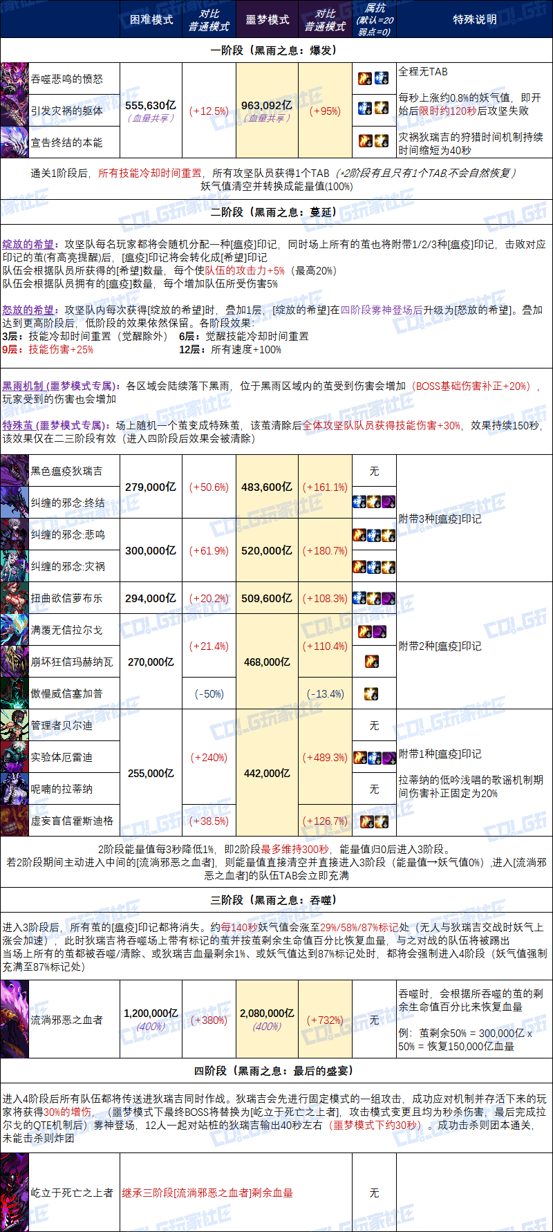 注:困难模式BOSS的1罐血=3亿,噩梦模式BOSS的1罐血≈5.2亿5.2/3≈1.733,即噩梦模式的血量约为困难模式的1.73倍另外,由于国服专属优化一阶段3个BOSS的血量共享,整合后的血量约为韩服原版3个BOSS血量总和的90%,相当于默认打270%血量就直接通关一阶段了*有问题会陆续调整 测试附录 关于血量 一阶段血量整合后为185210罐血,两个模式血条数量相同。下面分别在困难模式下削去178罐血、噩梦模式下削去180罐血所需造成的伤害进行推断血量,并对其他BOSS进行了验证无误测试图取自B站:豆了个饼 困难模式 噩梦模式 黑雨效果(噩梦专属) 位于黑雨地区的茧,BOSS的基础伤害补正+20% 特殊茧效果(噩梦专属) 但效果无法带到四阶段,仅在二三阶段有效屹立于死亡之上者(噩梦专属)有追踪斩击、龙卷风、进圈、躲光幕等随机攻击模式,具体参考官方的演示视频,所有的攻击伤害都非常高,基本碰一下就是满血秒杀 一段时间后会固定出现拉尔戈的QTE机制,随后雾神出现破防站桩对比困难模式下,噩梦模式的雾神出现时间点要更晚一些(打桩时间减少,大概不到30秒炸团) (来源:colg) |